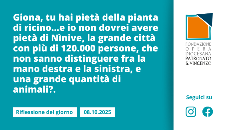 27.a settimana tempo ordinario Aforisma dal Libro del Profeta Giona “Giona, tu hai pietà della pianta di ricino…e io non dovrei avere pietà di Nìnive, la grande città con più di 120.000 persone, che non sanno distinguere fra la mano destra e la sinistra, e una grande quantità di animali?”. Santo del […]