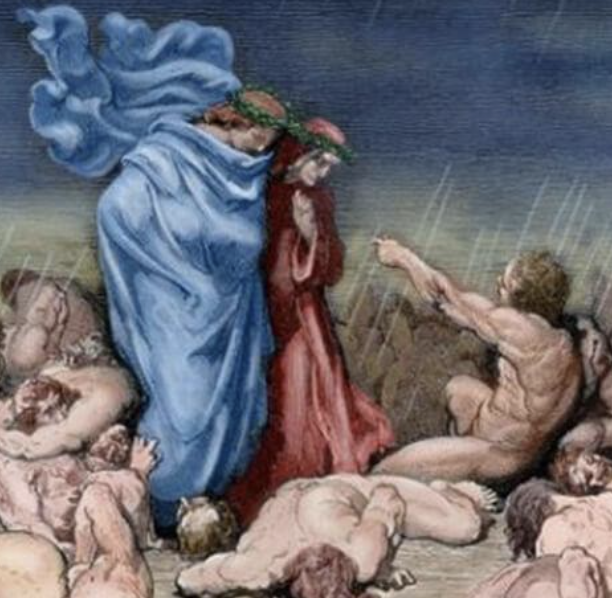 Dante e Virgilio proseguono e passano letteralmente sopra le anime, che essendo immateriali non oppongono ostacolo. Tutte giacciono al suolo, ma una di esse si leva improvvisamente a sedere e si rivolge a Dante, chiedendogli se lo riconosce, dal momento che il poeta è nato prima che lui morisse. Dante risponde che il suo aspetto è talmente stravolto da renderlo irricono-scibile, quindi gli domanda il suo nome, affermando che la pena sua e degli altri golosi è certo la più spiacevole dell’Inferno, se non addirittura la più grave. Il dannato risponde dichiarando anzitutto di essere stato cittadino di Firenze, la città che è piena di invidia. Il suo nome è Ciacco ed è condannato fra i golosi, che affollano in gran numero il Cerchio. Detto ciò, rimane in silenzio.