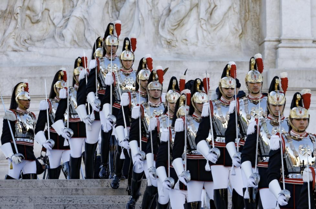 Roma. Corazzieri durante la deposizione della corona d’alloro alla tomba del Milite Ignoto, in occasione della giornata delle forze armate