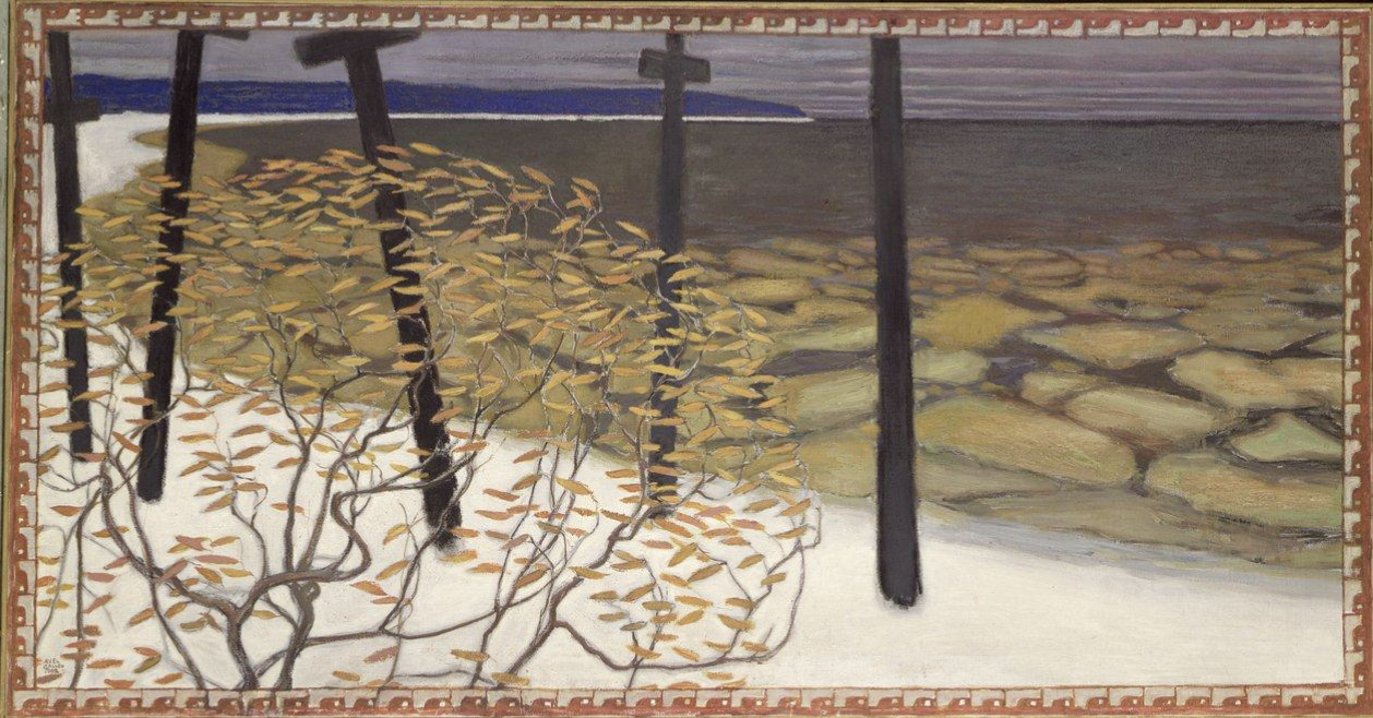 Autunno le cinque croci è un’ode malinconica alla natura che si avvicina al letargo invernale: il cielo buio fa presagire una tempesta; l’acqua del lago è scura e le foglie dell’albero in primo piano sono ingiallite. Questa tela fu dipinta infatti per il mausoleo destinato a ospitare le spoglie di una bimba morta a 11 anni e il pittore questo tragico fatto lo racconta attraverso il passaggio dall’estate alla stagione invernale e la presenza delle 5 croci nere in primo piano piantate nella candida sabbia della spiaggia che si prolunga assottigliandosi come sentiero di luce che si perde in lontananza, unico elemento luminoso che conferisce un tono dorato alle foglie appassite.