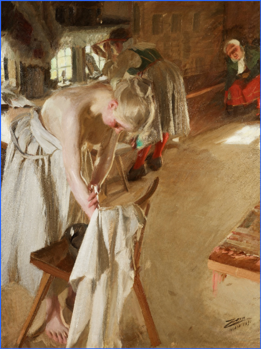 Il quadro che oggi presentiamo è opera del pittore svedese Anders Zorn (1860–1920) che nacque a Mora e studiò all’Accademia di Belle Arti di Stoccolma. Ci troviamo di fronte a un vero capolavoro di intimità e luce. In questo dipinto, Zorn cattura la quiete di una domenica mattina, con una giovane donna che si lava nell’ambiente modesto di una casa di paese insieme ad altre due. Nell’antico mondo contadino svedese le stanze dei casolari erano piccole e le persone, donne e bimbi si prendevano cura dell’igiene personale uno di fronte all’altro negli spazi comuni. Ma non si tratta di un dipinto “in presa diretta”, bensì di un ricordo dell’infanzia che l’artista ha trasferito nel quadro. Diventato adulto infatti, Zorn non ha potuto più assistere a scene del genere: ha perciò deciso di ricrearle utilizzando modelli che si muovevano nello spazio come nei suoi ricordi d’infanzia. La delicata tavolozza di colori e il gioco di luci e ombre conferiscono alla scena una calma quasi meditativa. nel mondo silenzioso di quel momento intimo. L’infanzia di Zorn ha giocato un ruolo importante nel suo lavoro e gran parte della sua produzione egli la intese come un tributo al passato. Zorn, noto per la sua capacità di raffigurare la pelle umana in tutte le sue sfumature, dimostra qui la sua maestria tecnica e la profonda comprensione del corpo umano. La composizione è semplice ma potente, e trascina lo spettatore nel mondo silenzioso di quel momento intimo della vita del pittore, più che in quella dei personaggi del suo quadro.