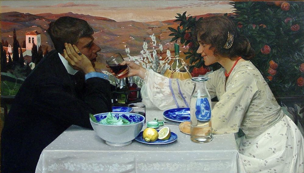 Il pittore danese Harald Slott-Møller (1864-1937) è considerato uno dei più grandi talenti del naturalismo e allo stesso tempo uno dei precursori del movimento sociale, politico e letterario dei paesi scandinavi. Nel quadro che oggi presentiamo il sole primaverile tramonta sulle montagne di Fiesole, a nord di Firenze. Una giovane coppia è seduta a un tavolo in attesa che venga servita la cena. La donna offre all’uomo un sorso dal suo calice di vino, e lui la guarda rapito.