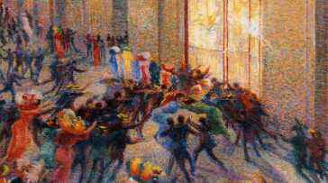 Densa di dinamismo futurista, l’atmosfera vivace e coloratissima della galleria appare permeata da un vorticoso turbinio di luci, giocate in risalti e contrasti cromatici con le ombre, a velocizzare lo scatto nervoso e la gestualità concitata dei corpi. La libertà dagli schemi tradizionali della pittura si esprime con pennellate fatte di colpi rapidi e sicuri, e con colori sfolgoranti, da caleidoscopio.