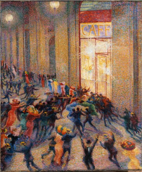 Umberto Boccioni (1882-1916) realizzò questo dipinto un anno dopo che Filippo Tommaso Marinetti aveva redatto il Manifesto del Futurismo un documento carico di energia e aggressività in cui abbondavano termini come lotta, schiaffo, disprezzo…La stessa violenza è evidente in questo quadro che mostra un vasto gruppo di esponenti dell’alta società in preda a un attacco di isteria nella più famosa galleria commerciale di Milano.