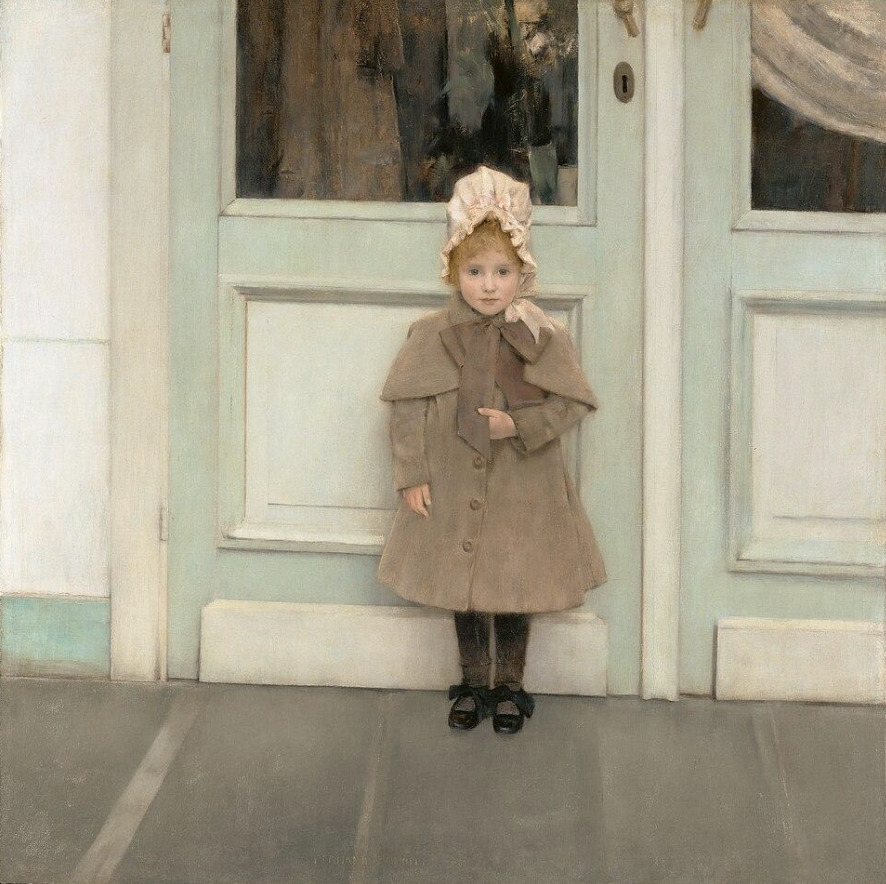 Spesso posava i suoi modelli appoggiati a una porta chiusa, appiattendo lo spazio e dando vita a una immagine meditativa ed ermetica. L’artista ha raffigurato la figlioletta di un amico compositore su un portico davanti a una porta chiusa: la bimba con il suo piccolo pollice afferra il bordo della sciarpa e infila la mano nel cappotto. Con questo piccolo gesto, Khnopff è riuscito a catturare la vulnerabilità e l’incertezza della bambina nell’affrontare il mondo esterno.