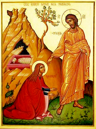 Maria stava all’esterno, vicino al sepolcro, e piangeva. Mentre piangeva, si chinò verso il sepolcro e vide due angeli in bianche vesti, seduti l’uno dalla parte del capo e l’altro dei piedi, dove era stato posto il corpo di Gesù. Essi le dissero: «Donna, perché piangi?». Rispose loro: «Hanno portato via il mio Signore e non so dove l’hanno posto». Detto questo, si voltò indietro e vide Gesù, in piedi; ma non sapeva che fosse Gesù. Le disse Gesù: «Donna, perché piangi? Chi cerchi?». Ella, pensando che fosse il custode del giardino, gli disse: «Signore, se l’hai portato via tu, dimmi dove l’hai posto e io andrò a prenderlo». Gesù le disse: «Maria!». Ella si voltò e gli disse in ebraico: «Rabbunì!» – che significa: «Maestro!». Gesù le disse: «Non mi trattenere, perché non sono ancora salito al Padre; ma va’ dai miei fratelli e di’ loro: “Salgo al Padre mio e Padre vostro, Dio mio e Dio vostro”». Maria di Magdala andò ad annunciare ai discepoli: «Ho visto il Signore!» e ciò che le aveva detto.
