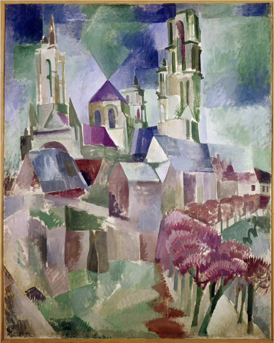 Il quadro “I campanili di Laon” è stato realizzato in base a queste nuove esperienze pittoriche e mostra le guglie gotiche di una chiesa gotica del XIV secolo che si innalzano al di sopra della città dove il pittore aveva svolto il servizio militare nel 1907. Le strutture grigie di Braque e Picasso, simili a ragnatele, avevano fortemente impressionato Delaunay che decise di arricchire i loro scheletri scuri con colori vivaci applicati delicatamente.