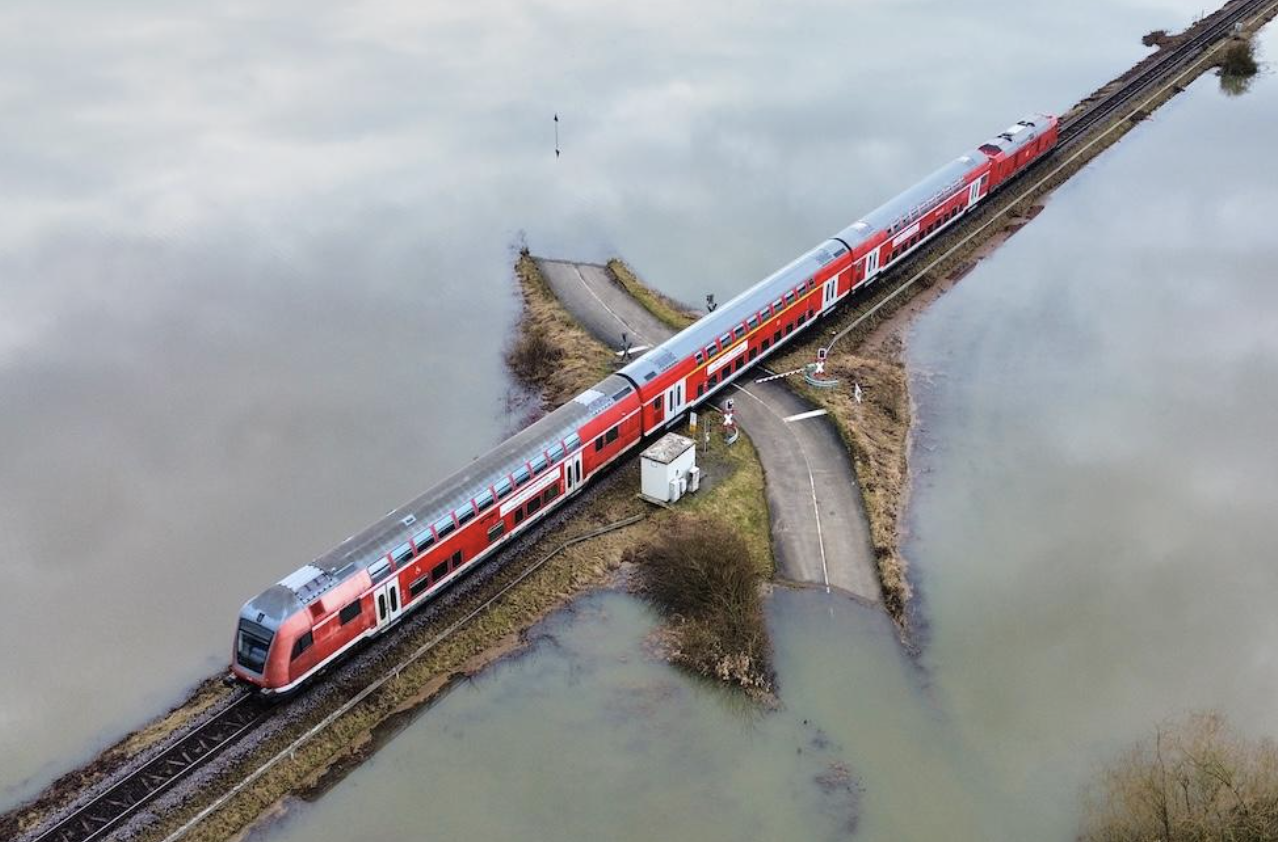 Un treno regionale tra i campi allagati a Nidderau-Eichen, vicino a Francoforte