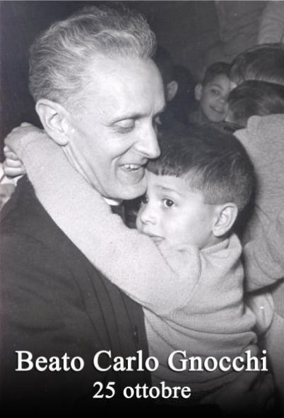 Carlo Gnocchi, nacque da una povera famiglia in provincia di Milano e diocesi di Lodi nel 1902. Alla morte del padre si trasferì a Milano. Entrato nel Seminario, fu ordinato prete nel 1925. Dopo alcuni anni come curato, fu nominato assistente spirituale dell’Istituto Gonzaga degli Scolopi, a Milano. Allo scoppio della 2.a guerra mondiale, partì come cappellano militare volontario per il fronte greco–albanese, per condividere la sorte dei suoi giovani. Ritornò nel 1942 ma ripartì per la Russia con gli alpini.
