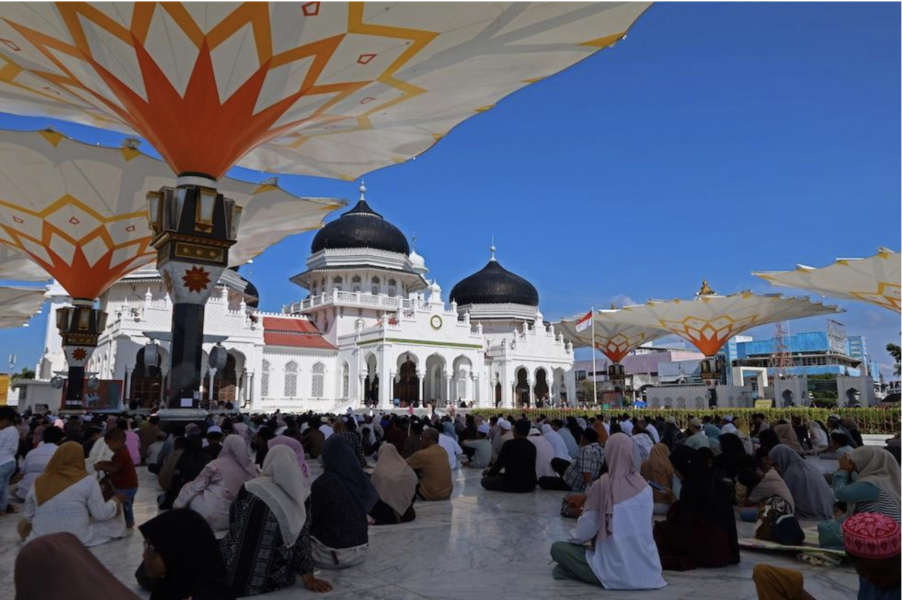 Persone in preghiera nella Grande moschea di Baiturrahman per ricordare lo tsunami nell’oceano Indiano, che il 26-12-2004 provocò la morte di circa 230mila persone, la maggior parte delle quali in Indonesia