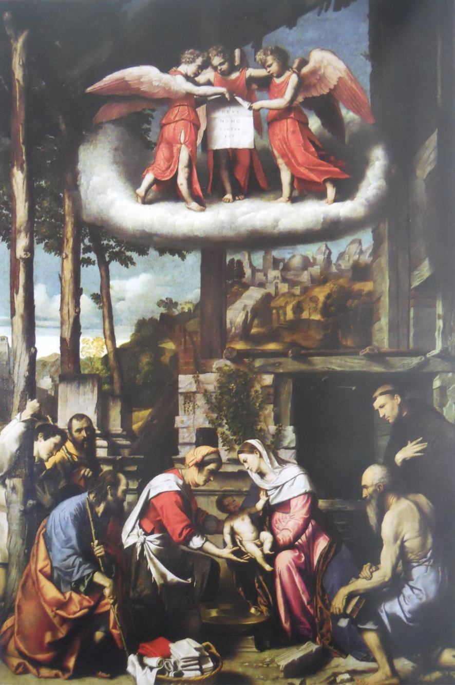Il dipinto “Natività con S. Girolamo e un donatore girolimino” del pittore bresciano Alessandro Bonvicino detto il “Moretto” (1492 – 1554), ma la cui famiglia era originaria di Ardesio (Bg) è un’opera significativa del tardo periodo dell’artista, caratterizzata da atmosfere intime e spirituali, dove il tema sacro si fonde con la devozione privata del donatore, un monaco eremita di S. Girolamo, creando un dialogo tra il Divino Bambino e i santi intermediari.