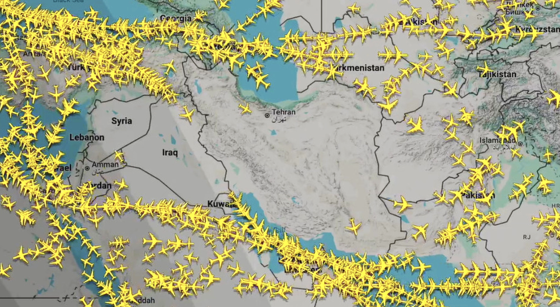 Mappa traffico aereo nel Medio Oriente dopo l’attacco di Israele e USA all’Iran del 28-3-2026