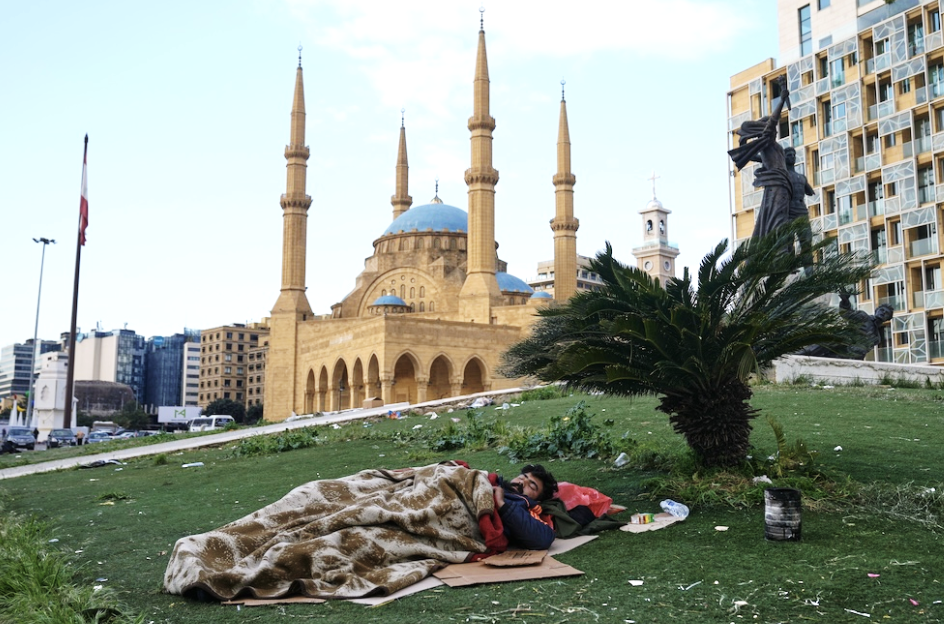 BEIRUT, LIBANO: Un uomo sfollato a causa dei bombardamenti israeliani dorme in un parco nel quartiere di Dahieh, zona nel sud della città dove è più radicato Hezbollah, il gruppo militare e politico alleato dell’Iran