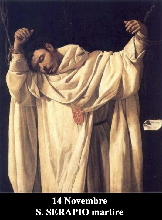 Di origine inglese, Serapio, nacque verso l’anno 1179. Militare nella corte d’Austria, partecipò alla crociata in Terra Santa nel 1217, poi fu inviato in Spagna a combattere i mori. Ebbe così occasione di conoscere S. Pietro Nolasco e attratto dalla eroica carità dei mercedari, chiese di ricevere l’abito di cavaliere laico dell’Ordine. Nominato maestro dei novizi, cercò di rifiutare ritenendosi indegno, ma non potendo fare altrimenti, accettò affidandosi a Dio e alla Vergine de la Merced. Insegnò più con la vita, che con le parole e dalla sua scuola uscirono religiosi illustri come San Raimondo Nonnato.
