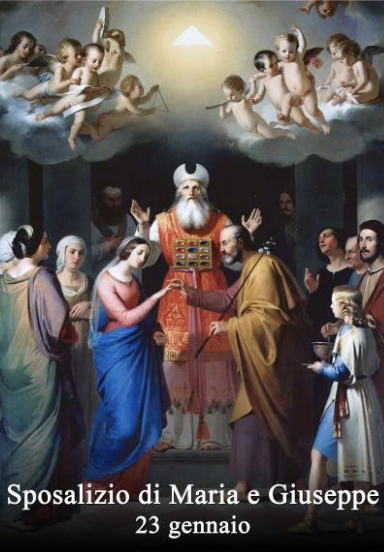 Secondo un’antica tradizione, il 23 gennaio si fa memoria dello sposalizio della Vergine Maria e di san Giuseppe. Da sempre gli artisti hanno realizzato autentici capolavori in riferimento a questo evento. Sembra che le origini liturgiche di questa festa siano riferibili agli inizi del XV secolo. A partire dal secolo successivo, tale festa fu accolta tra le celebrazioni di diversi Ordini religiosi, quali i Francescani, i Servi di Maria e i Domenicani.