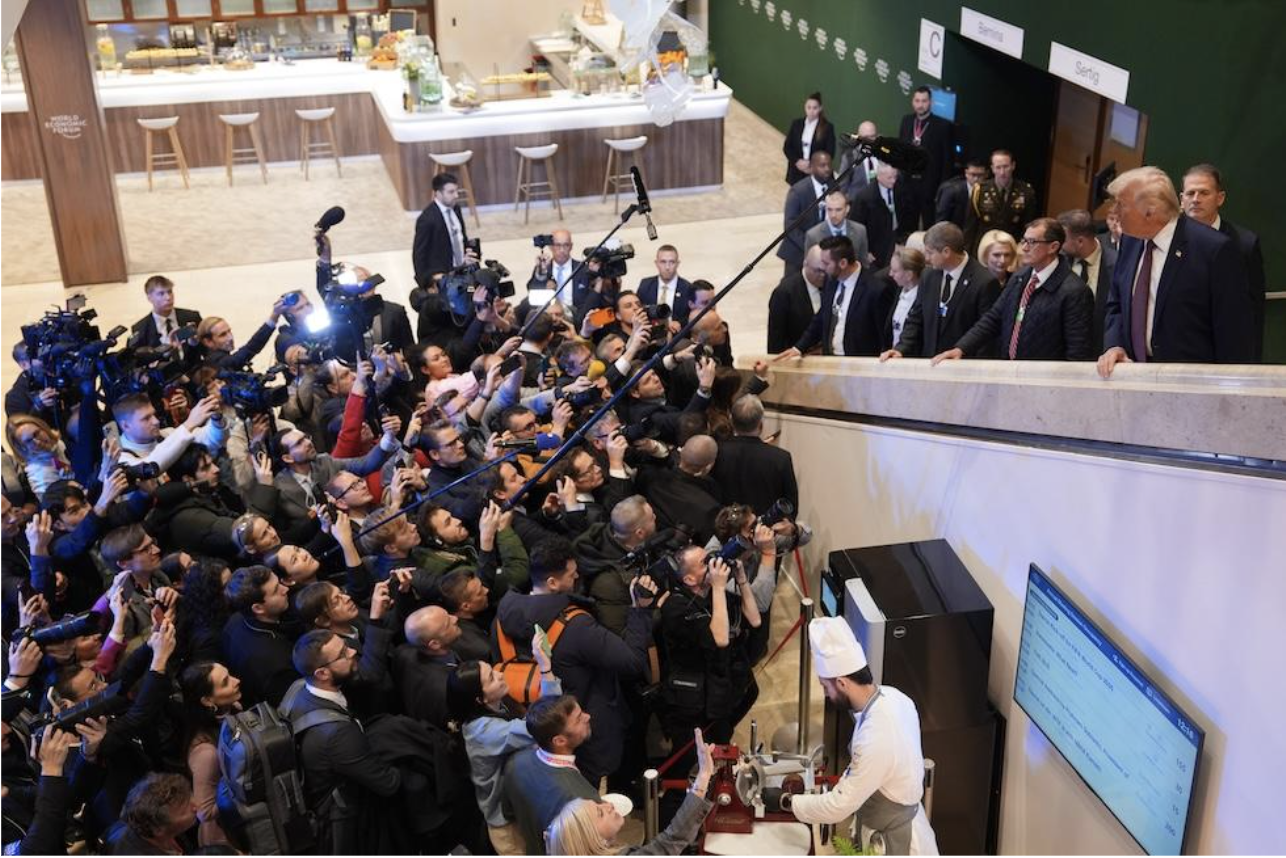 Giornalisti accalcati vicino al presidente statunitense Donald Trump, mentre sale le scale al Forum di Davos
