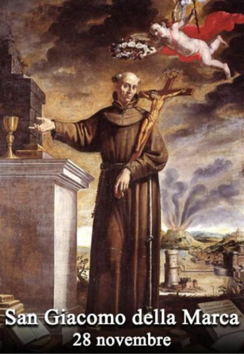 Nato a Monteprandone (Ascoli Piceno) nelle Marche nel 1394 Giacomo fu discepolo di S. Bernardino da Siena, dal quale ricevette a 22 anni il saio francescano. Fu un francescano fuori dal comune per la sua signorilità: sicuro e determinato, sapeva conciliare carità e Giudizio di Dio; teologo e inquisitore severo, ma pietoso.